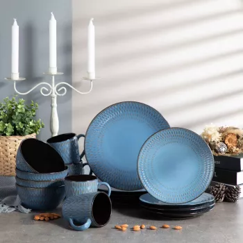 16 Piece Blue Stoneware Dinner Set – Elegant Floral Embossed Plates & Bowls